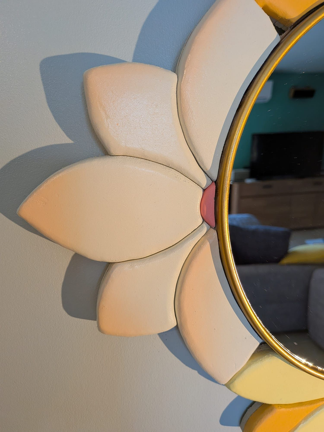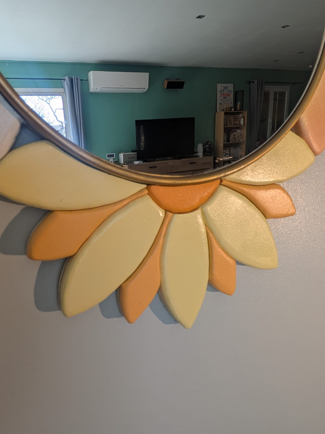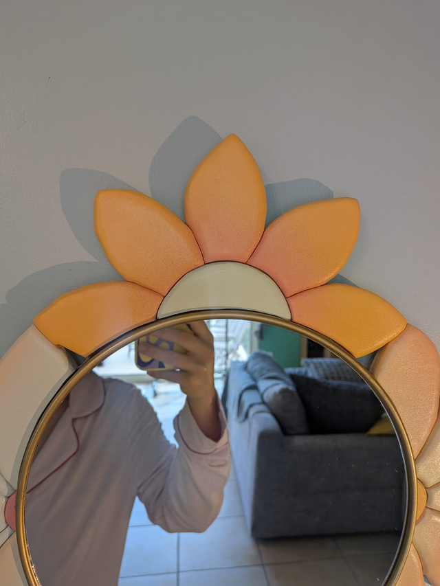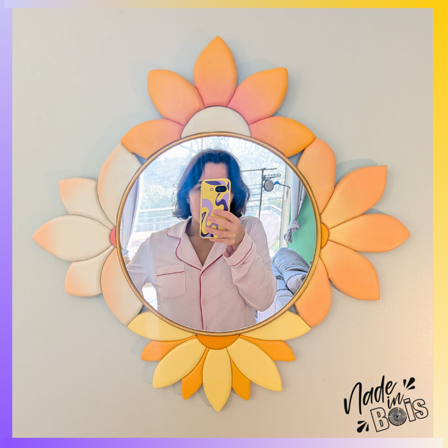 Ce miroir en forme de fleur apporte une touche de douceur et de lumière à votre intérieur. Son dégradé de couleurs orange pastel (camaïeu) en fait une pièce de décoration à la fois moderne et chaleureuse.