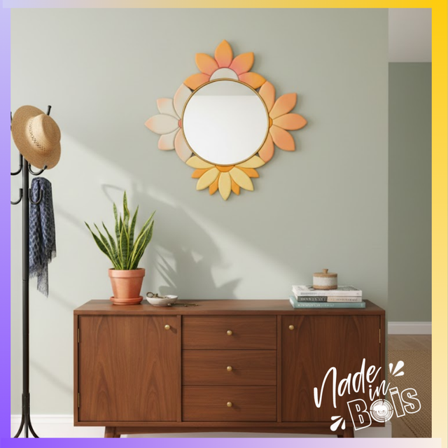 Chaque pièce est 100 % découpée et façonnée à la main, sans aucune découpe laser. Ce processus manuel confère à ce miroir un caractère unique : vous ne trouverez jamais deux pièces exactement identiques.